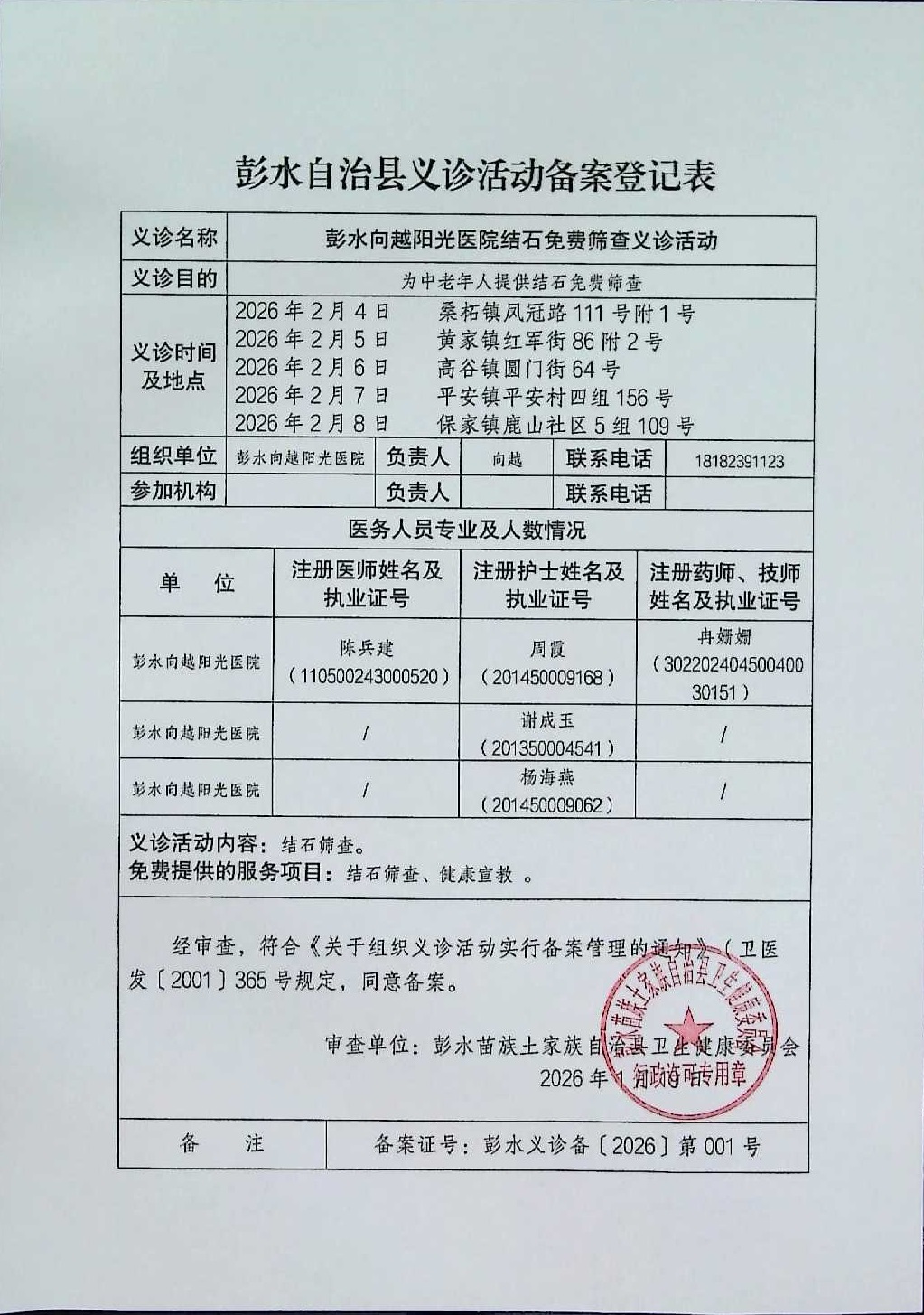 彭水向越阳光医院2026年2月份结石免费筛查义诊备案凭证