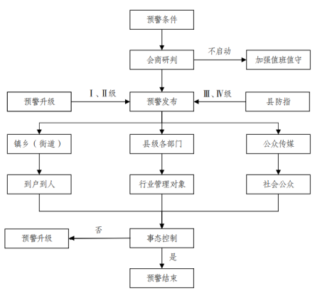 县防指发布Ⅳ级预警信息有升为Ⅲ级以上趋势的,应及时上报县政府,按规定程序调整预警级别并重新发布。县政府或县防指发布的Ⅲ级预警信息,有升为Ⅱ级以上趋势的,应及时上报市政府或市防指,由市政府或市政府授权的市防指按规定启动预警信息发布程序。