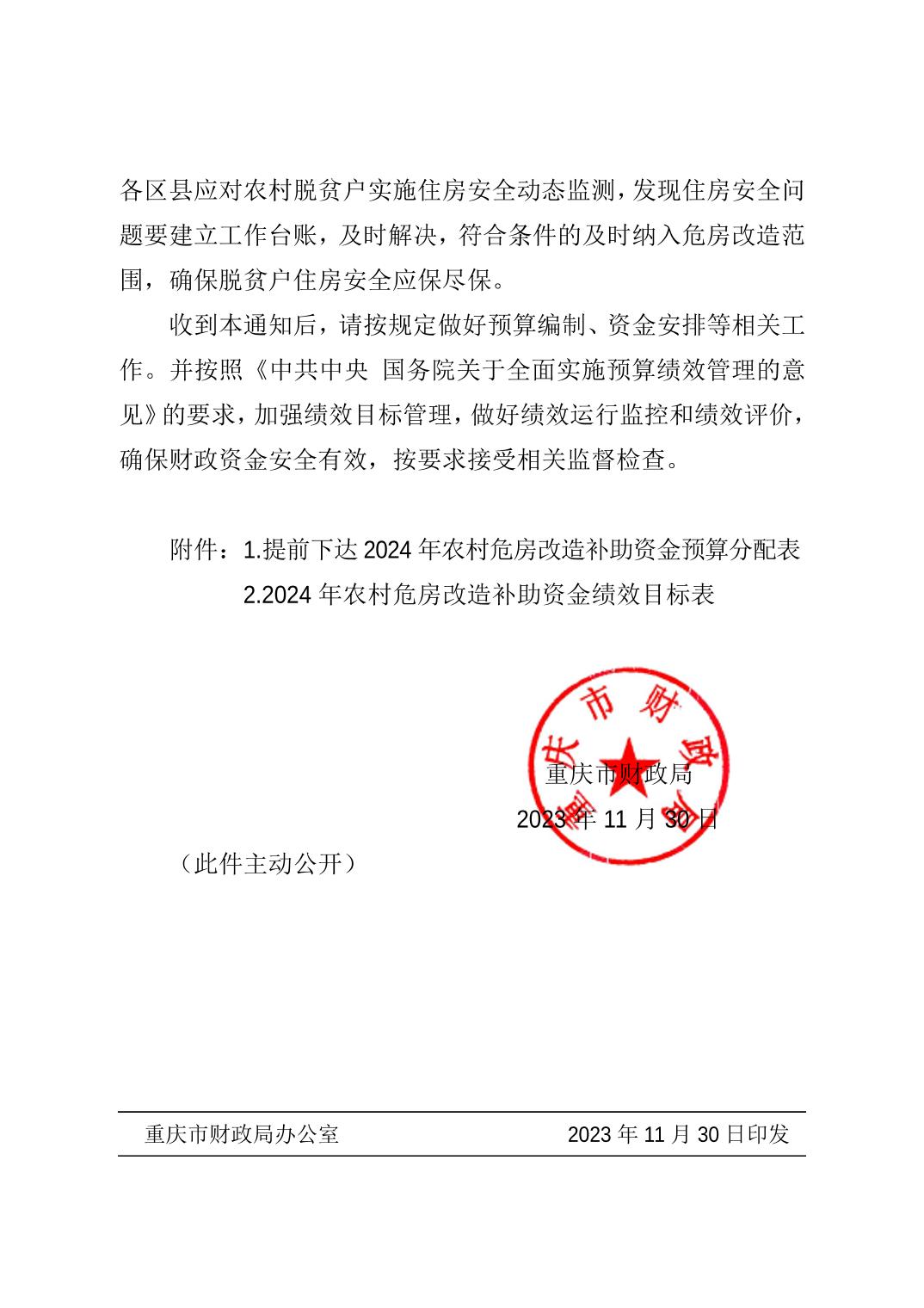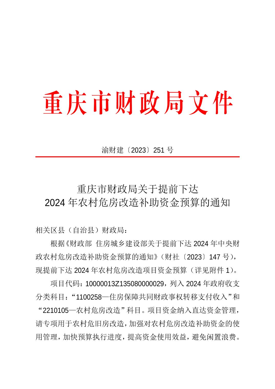 重庆市财政局关于提前下达 2024 年农村危房改造补助资金预算的通知