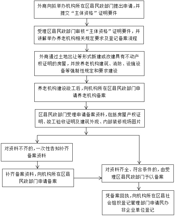 外商捐资举办非营利性养老机构,应符合消防、卫生健康、环境保护、食品药品、建筑、设施设备标准中的强制性规定及要求,可在不取得消防验收合格证明及收住老年人的条件下,直接向机构所在区县民政部门申请备案。对符合条件的,由区县民政部门出具《设置养老机构备案回执》。外商捐资举办者凭《设置养老机构备案回执》以及民办非企业单位成立登记申报材料,向机构所在区县社会组织登记管理机关申报设立非营利性养老机构的民办非企业单位。机构所在区县民政部门作为该民办非企业单位的业务主管单位。具体登记备案流程见附件。