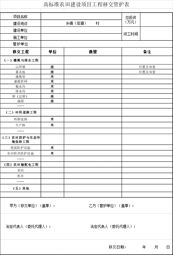 (五)规范管护移交。高标准农田建设项目通过竣工验收后,项目法人应在30日内与项目区所在乡镇政府(街道办事处)完成建设项目工程管护移交工作。乡镇政府(街道办事处)将建设项目工程管护移交村(居)民委员会,并报县级农业农村部门备案。管护主体应将管护责任落实到人。