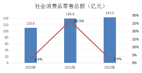 图3:2020—2022年社会消费品零售总额及同比增幅